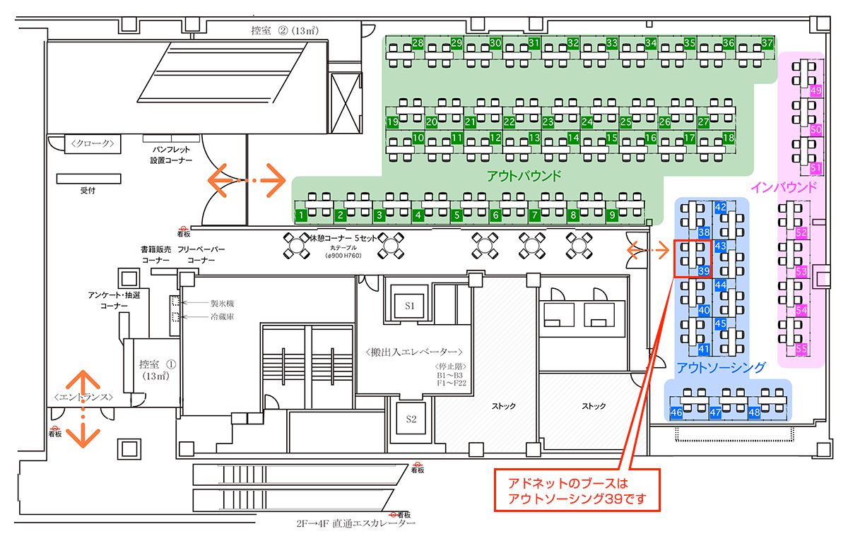 東京都千代田区外神田 4-14-1 秋葉原UDX 南ウィング4F アクセスはこちら ※アドネットのブースはアウトソーシングNo39です。 平面図はこちら